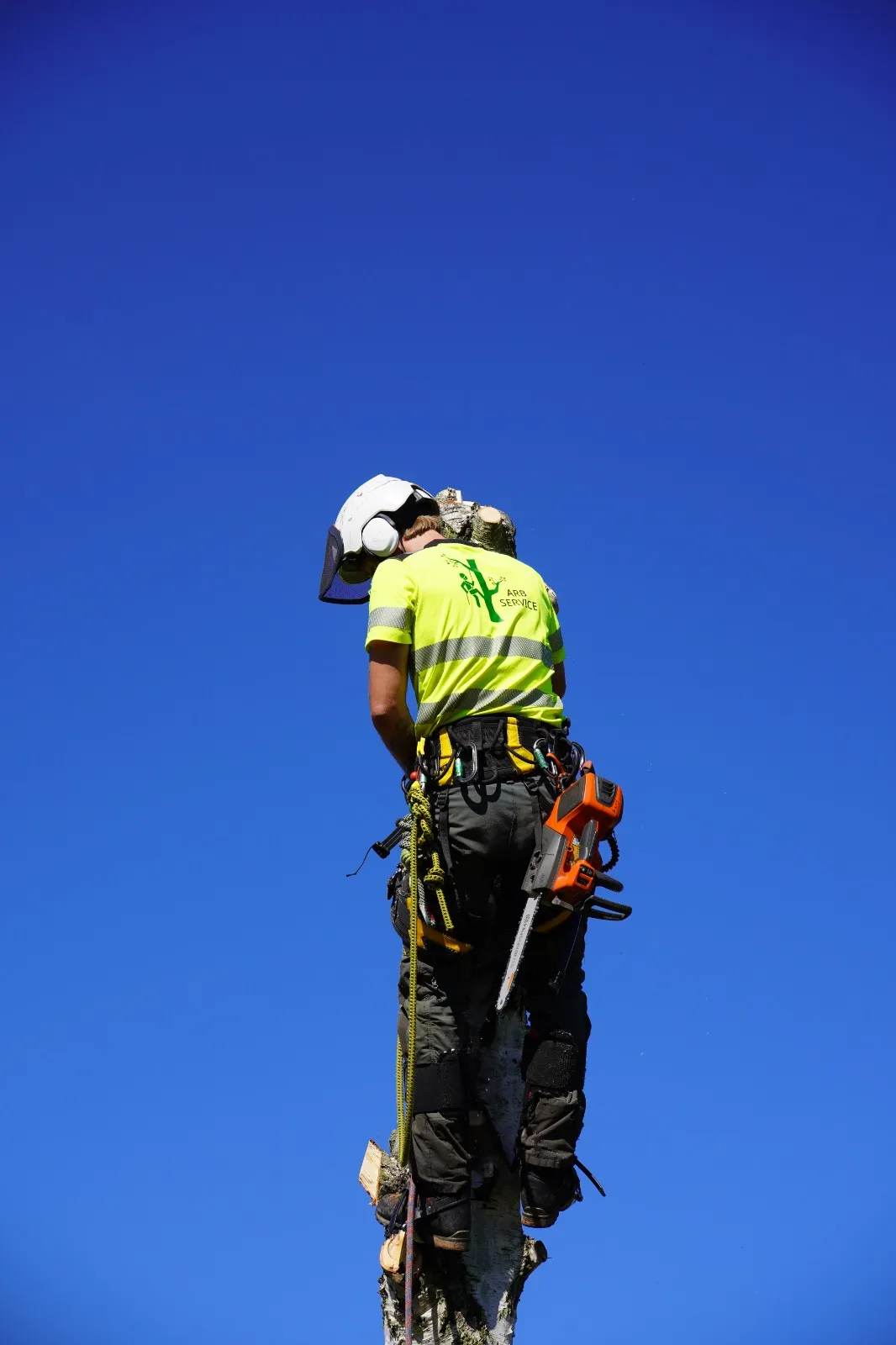Trädet tas ner kontrollerat. Ris flisas eller körs bort, ved staplas på begäran, stubben kan fräsas.